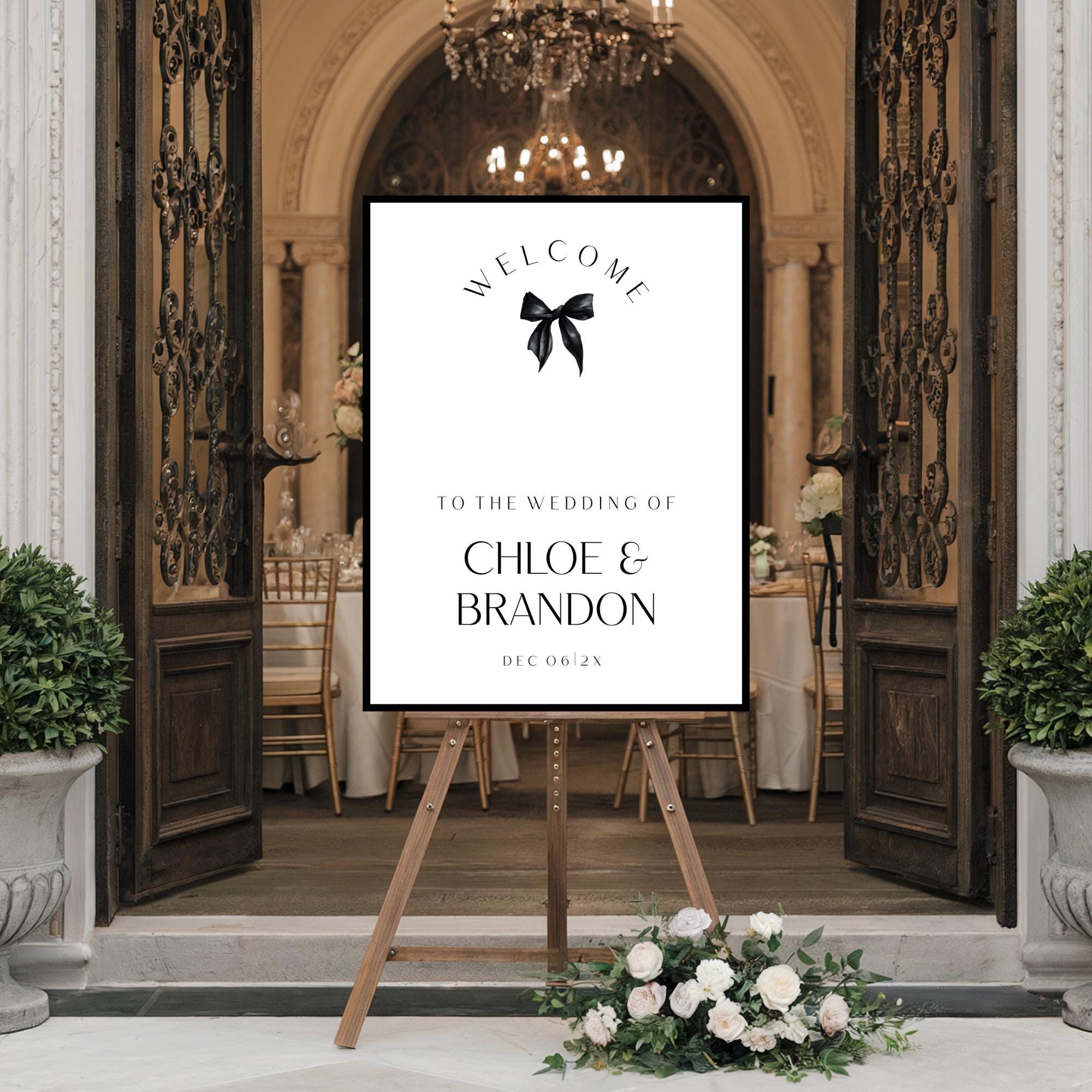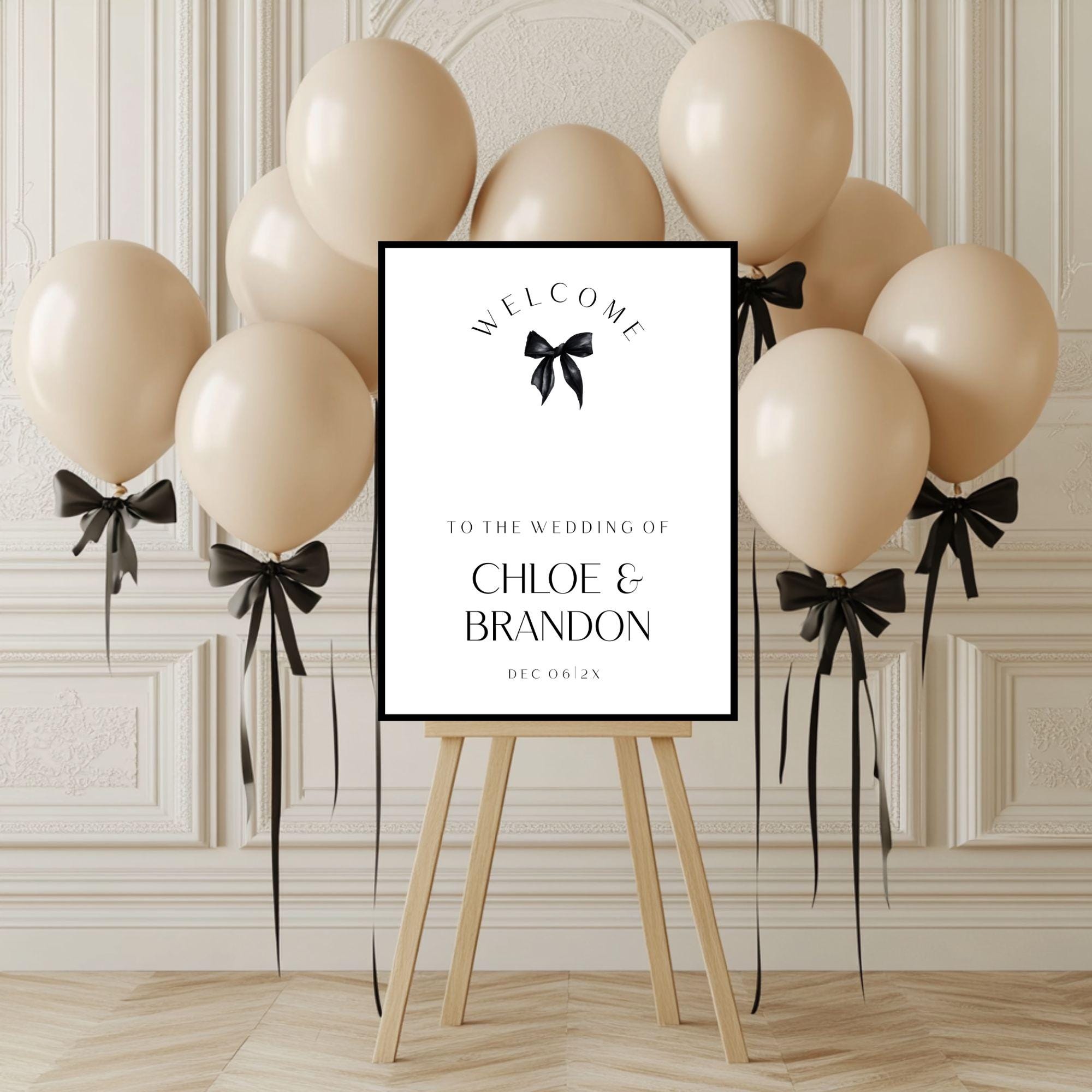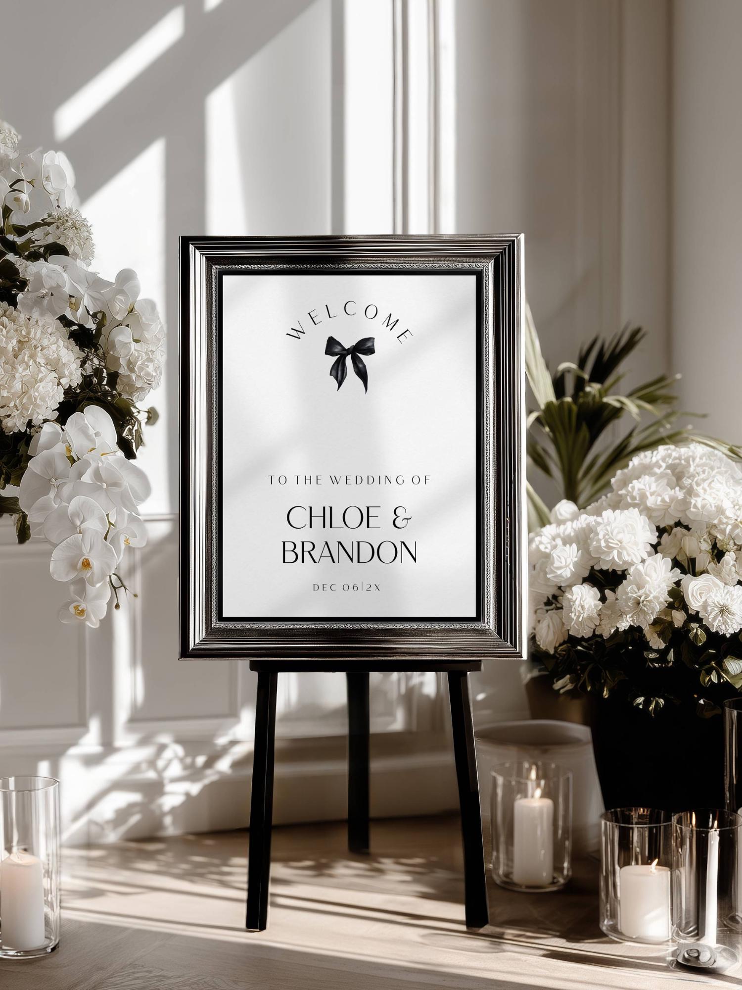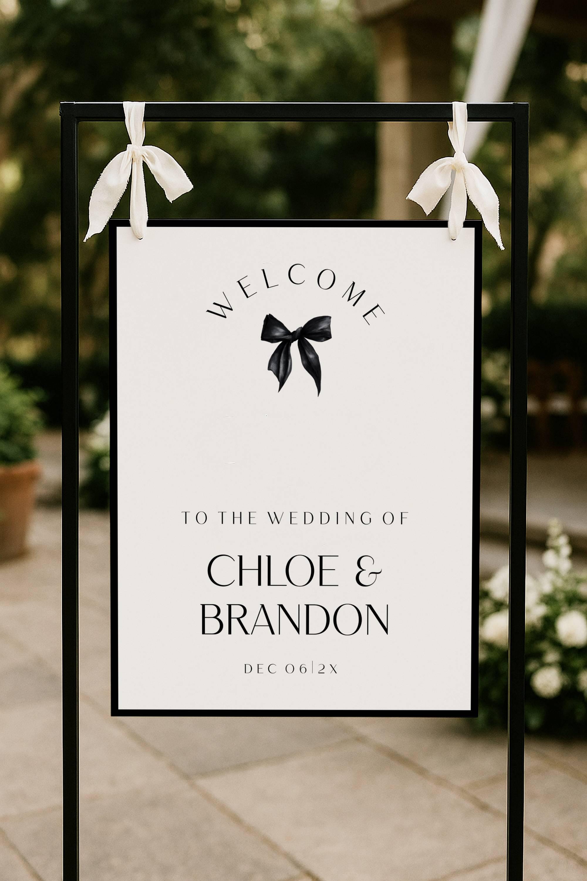 Minimalist Black Bow Wedding Welcome Sign Template. An Instant download digital file for you to edit in your web browser with Templett straight after your purchase. Once personalized you are ready to print.