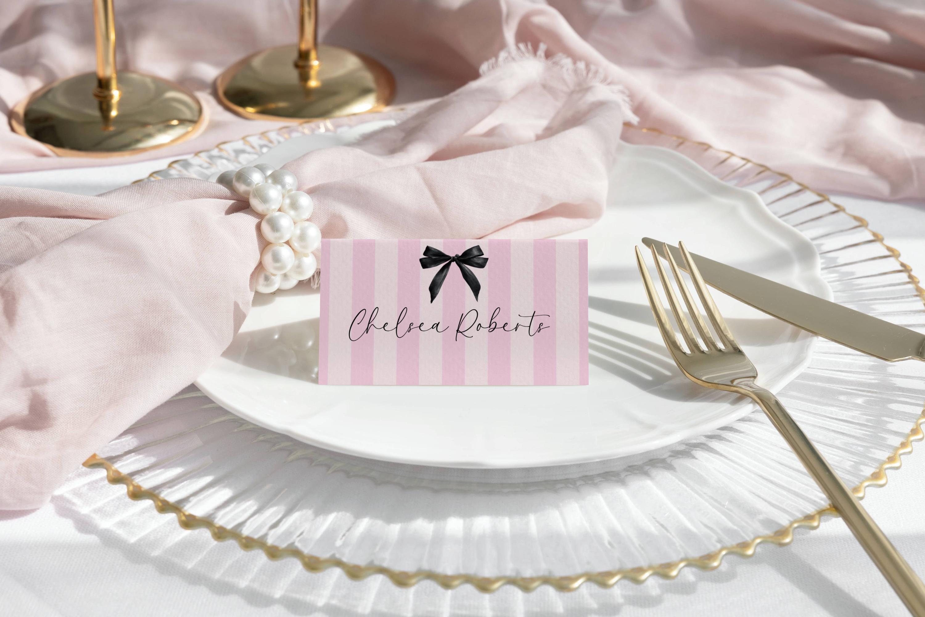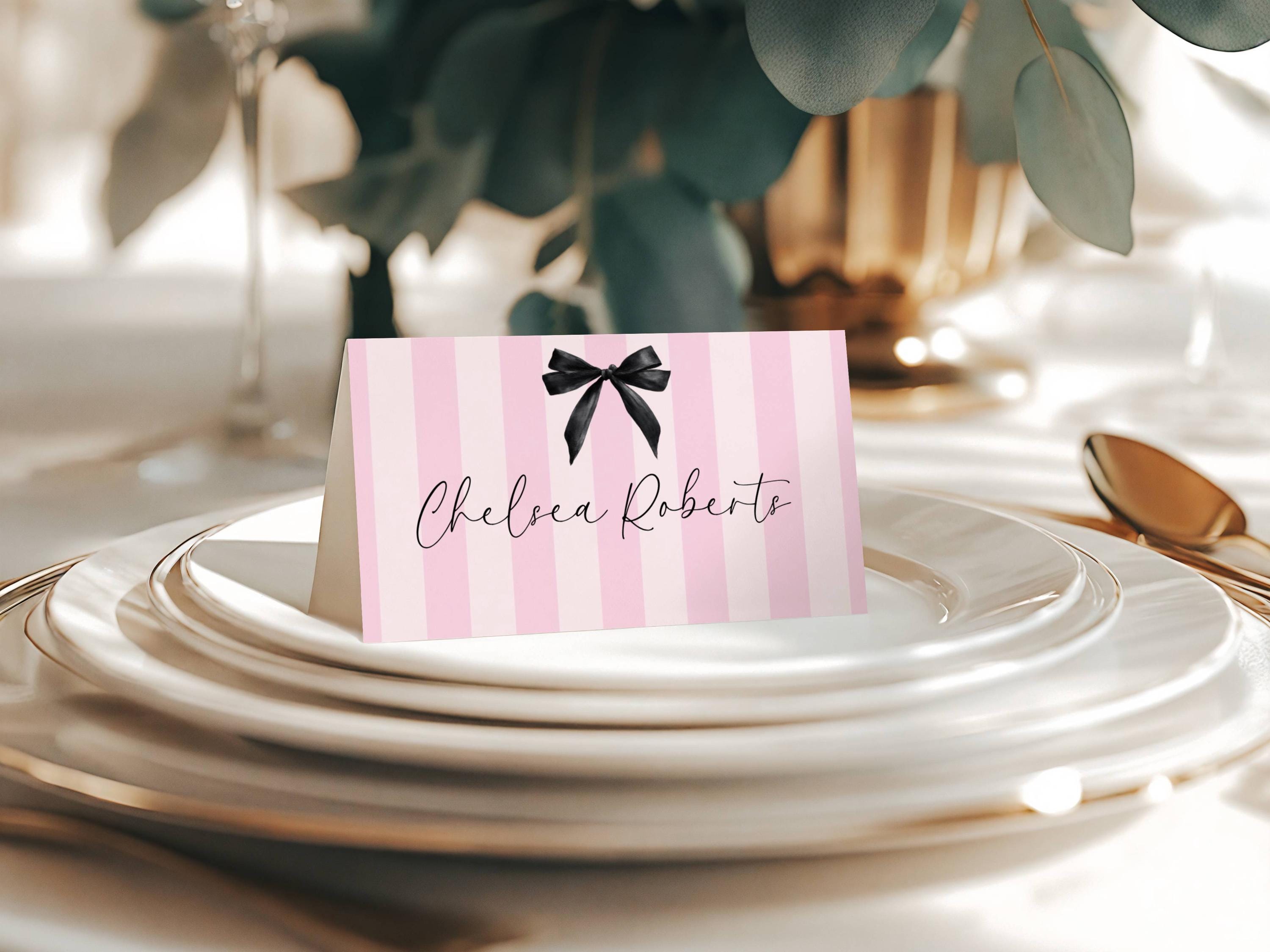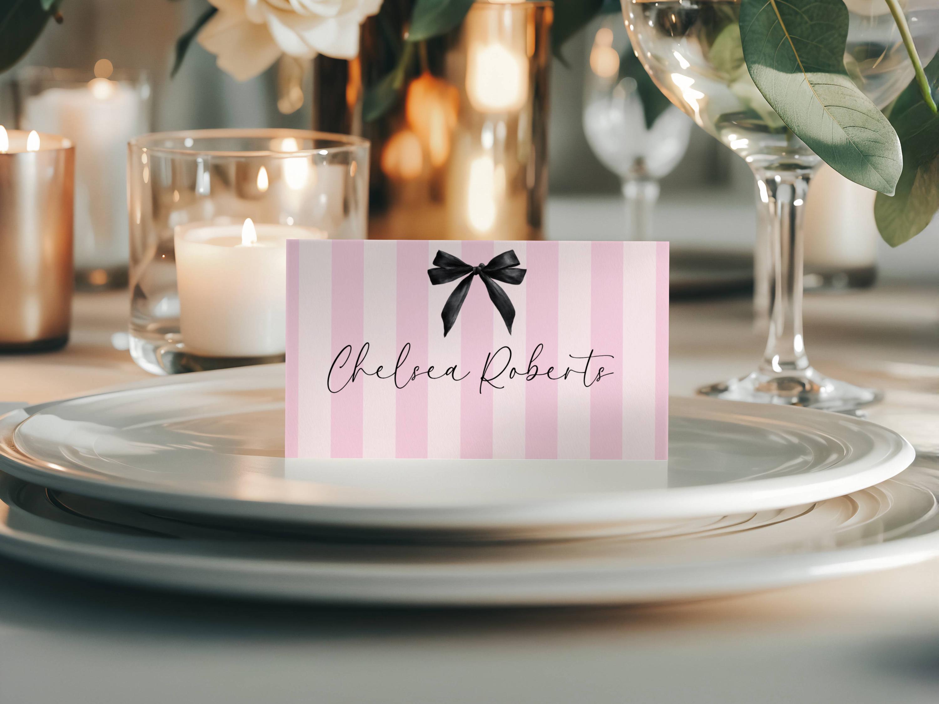 Modern Black Bow Place Card Template. An Instant download digital file for you to edit in your web browser with Templett straight after your purchase. Once personalized you are ready to print.