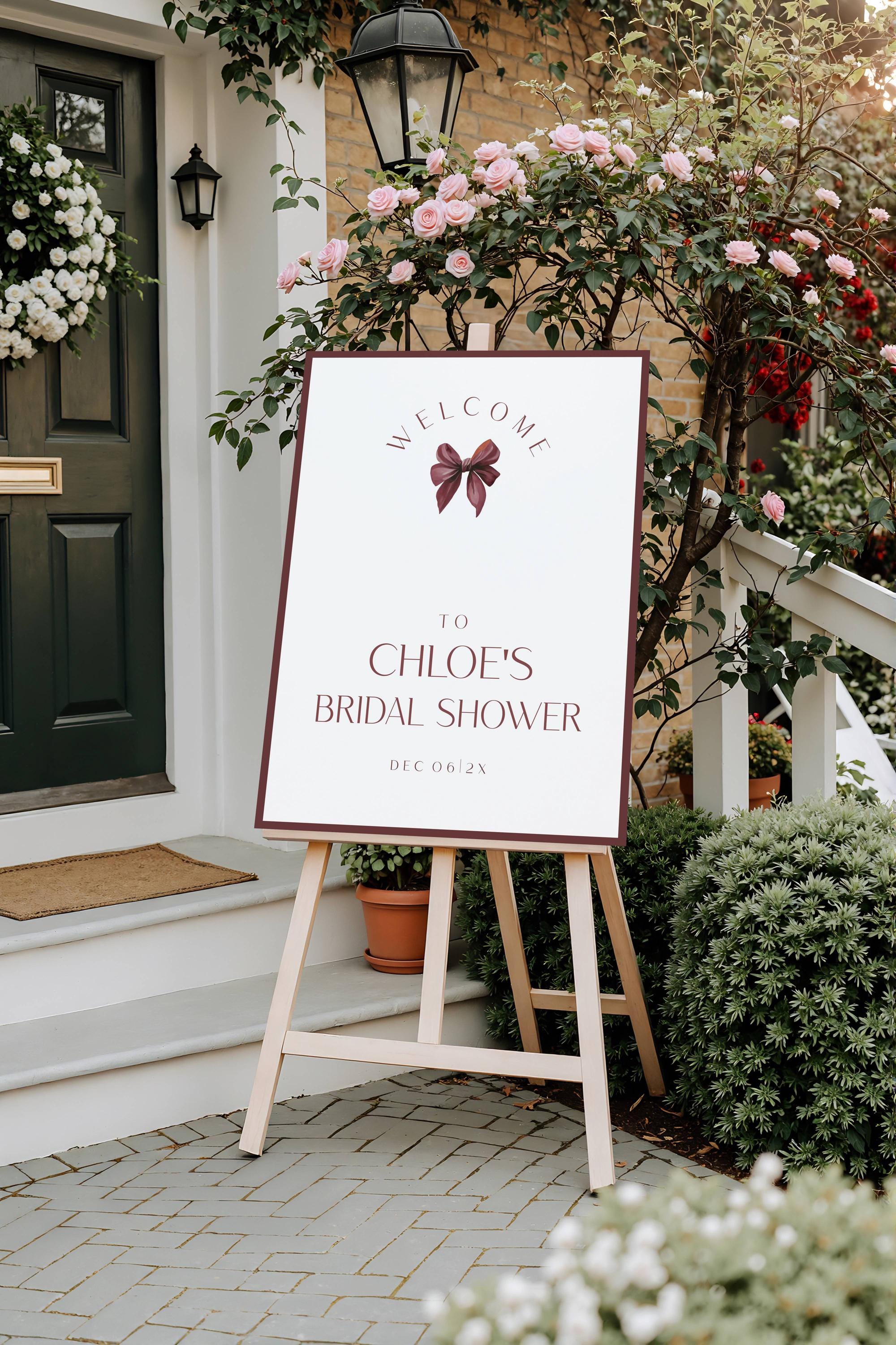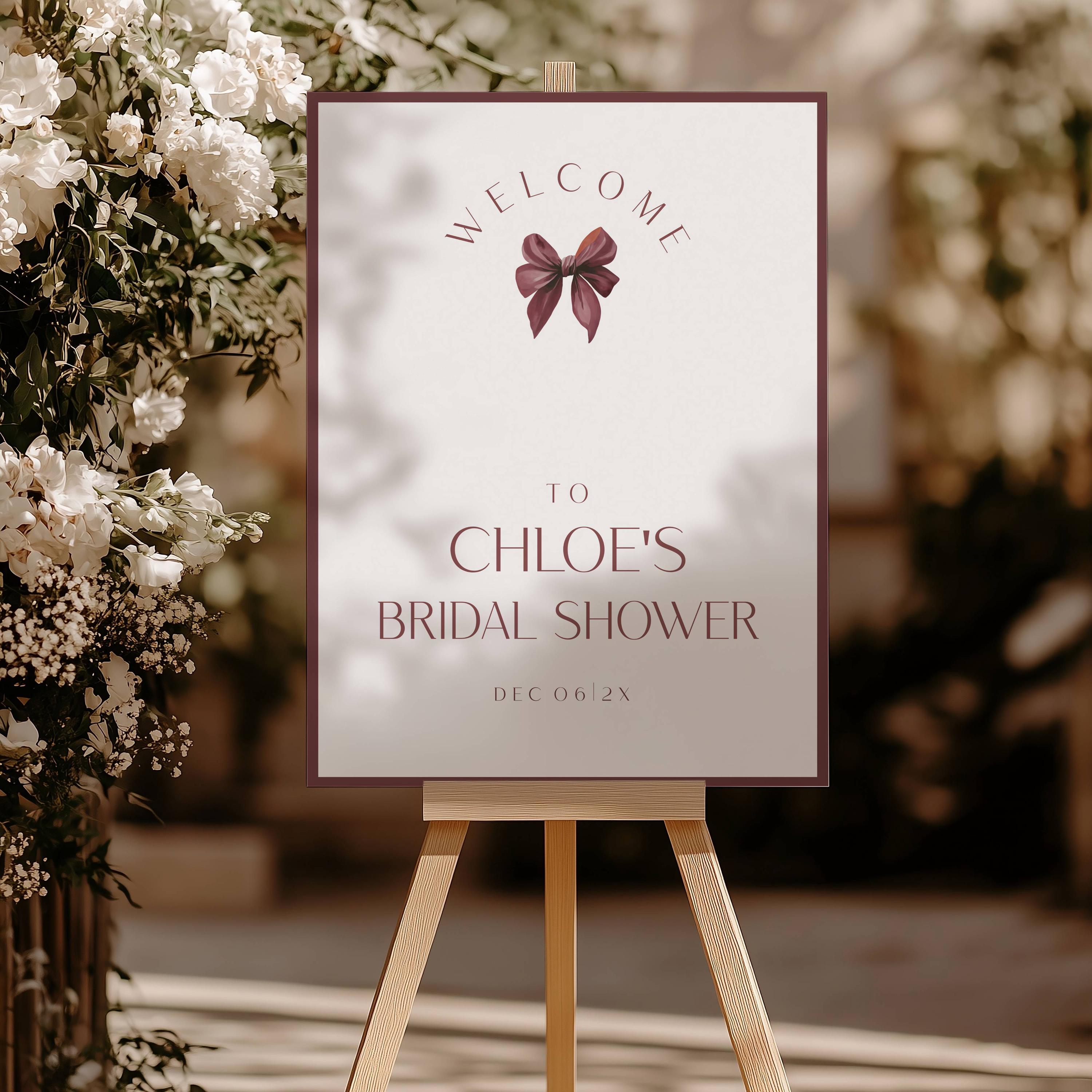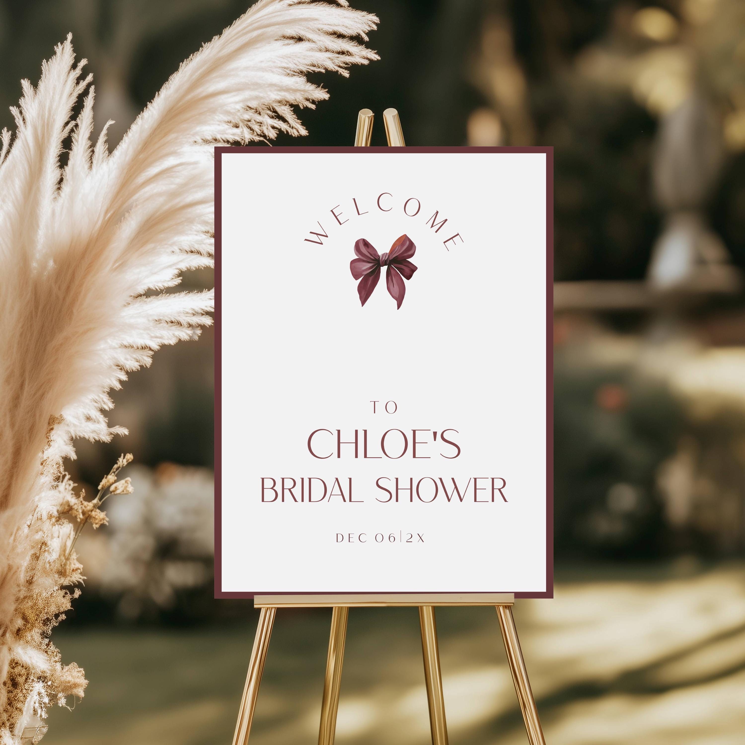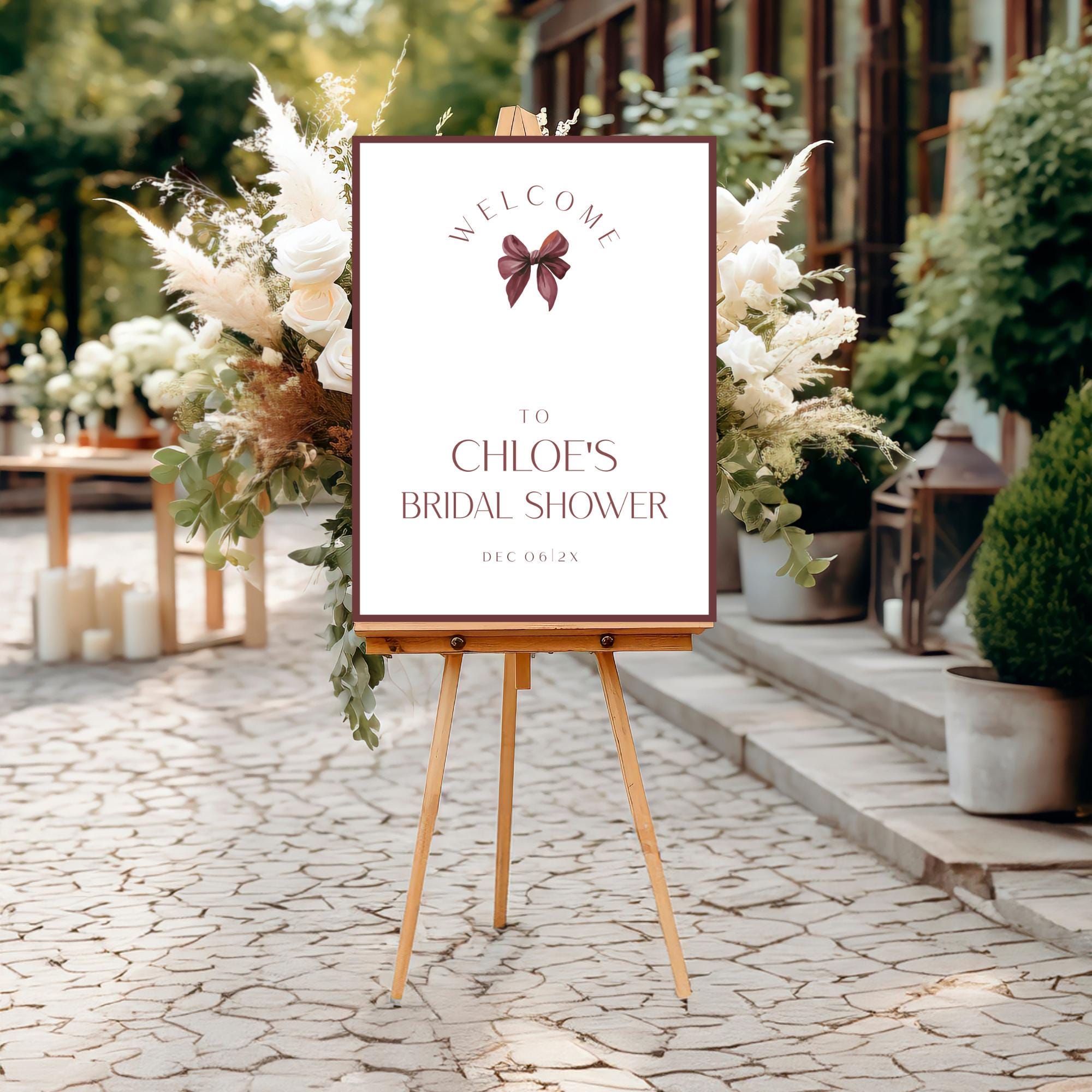 Burgundy Bow Bridal Shower Welcome Sign Template. An Instant download digital file for you to edit in your web browser with Templett straight after your purchase. Once personalized you are ready to print.