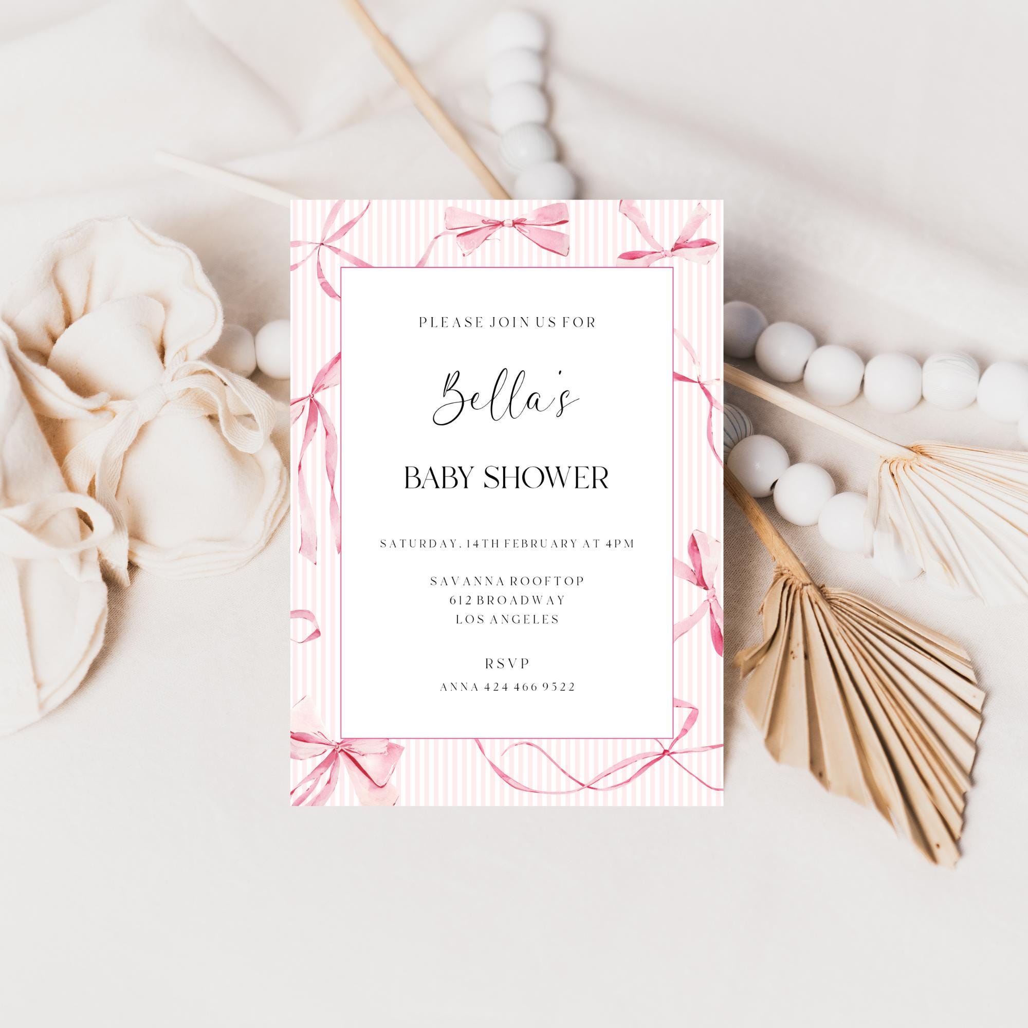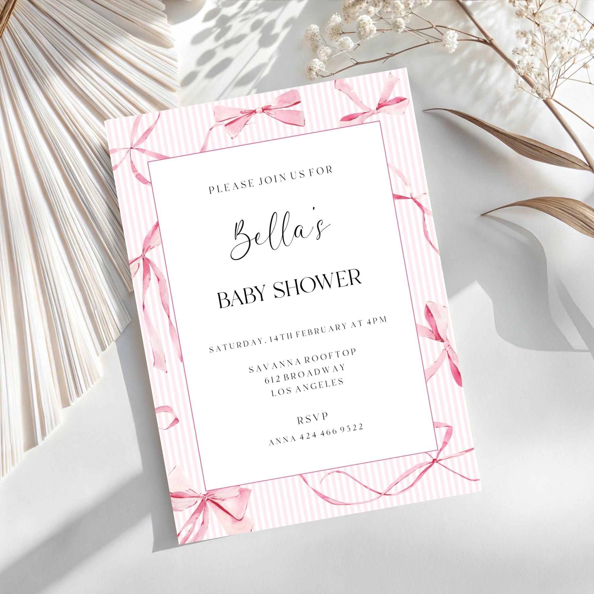 Pink Bows Baby Shower Invitation Template. An Instant download digital file for you to edit in your web browser with Templett straight after your purchase. Once personalized you are ready to print.
