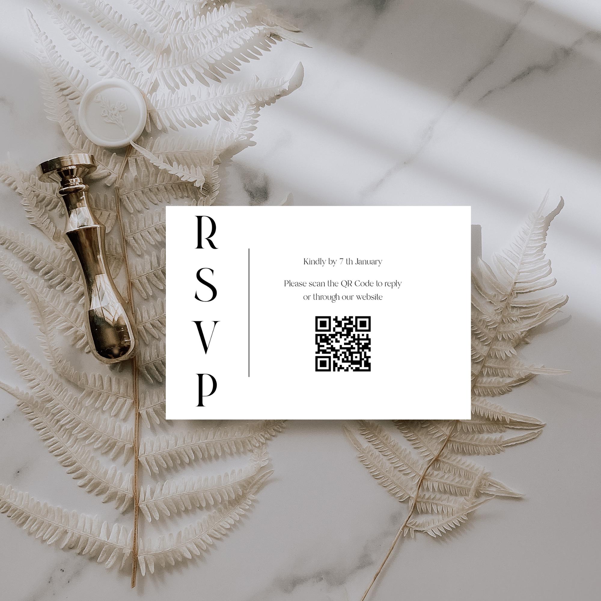 You will need to replace the QR Code by creating your own and uploading the new one that links to your wedding website. There are many websites that you can create a free custom QR code. If you don't want to use a QR Code you can easily delete this from the Template. If the Rsvp does not have a QR code, you can simply upload one.