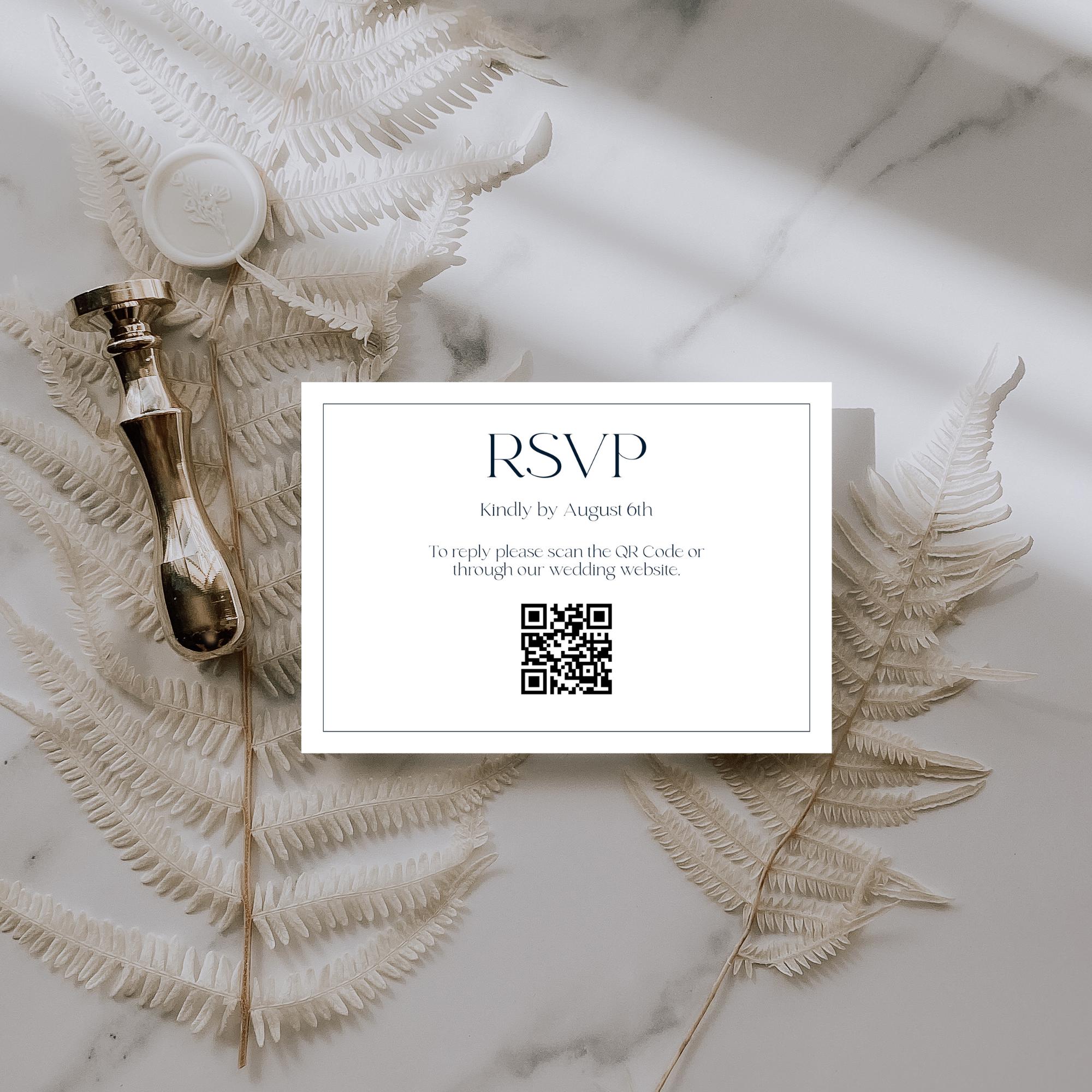 You will need to replace the QR Code by creating your own and uploading the new one that links to your wedding website. There are many websites that you can create a free custom QR code. If you don't want to use a QR Code you can easily delete this from the Template. If the Rsvp does not have a QR code, you can simply upload one.