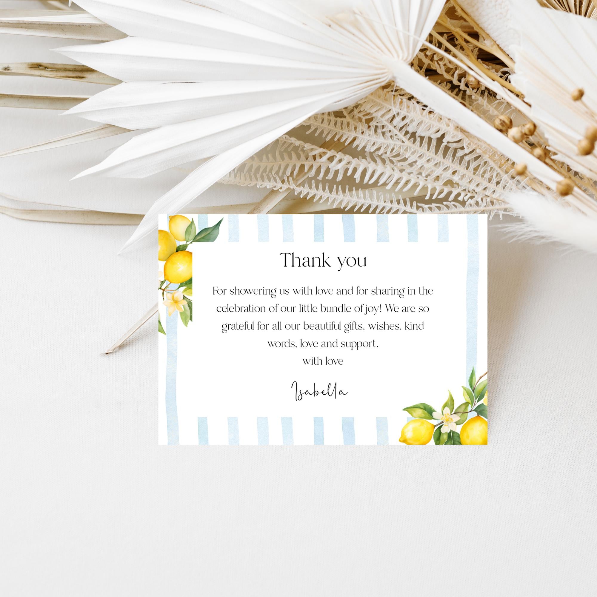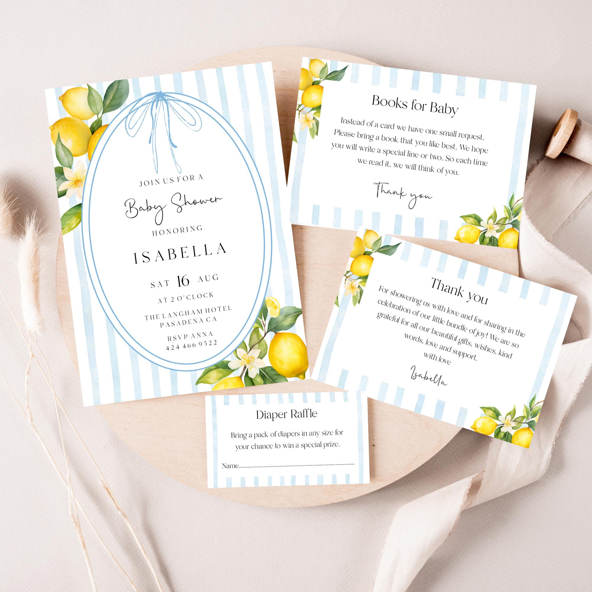 Lemons Baby Shower Invitation Set Template. An Instant download digital file for you to edit in your web browser with Templett straight after your purchase. Once personalized you are ready to print.