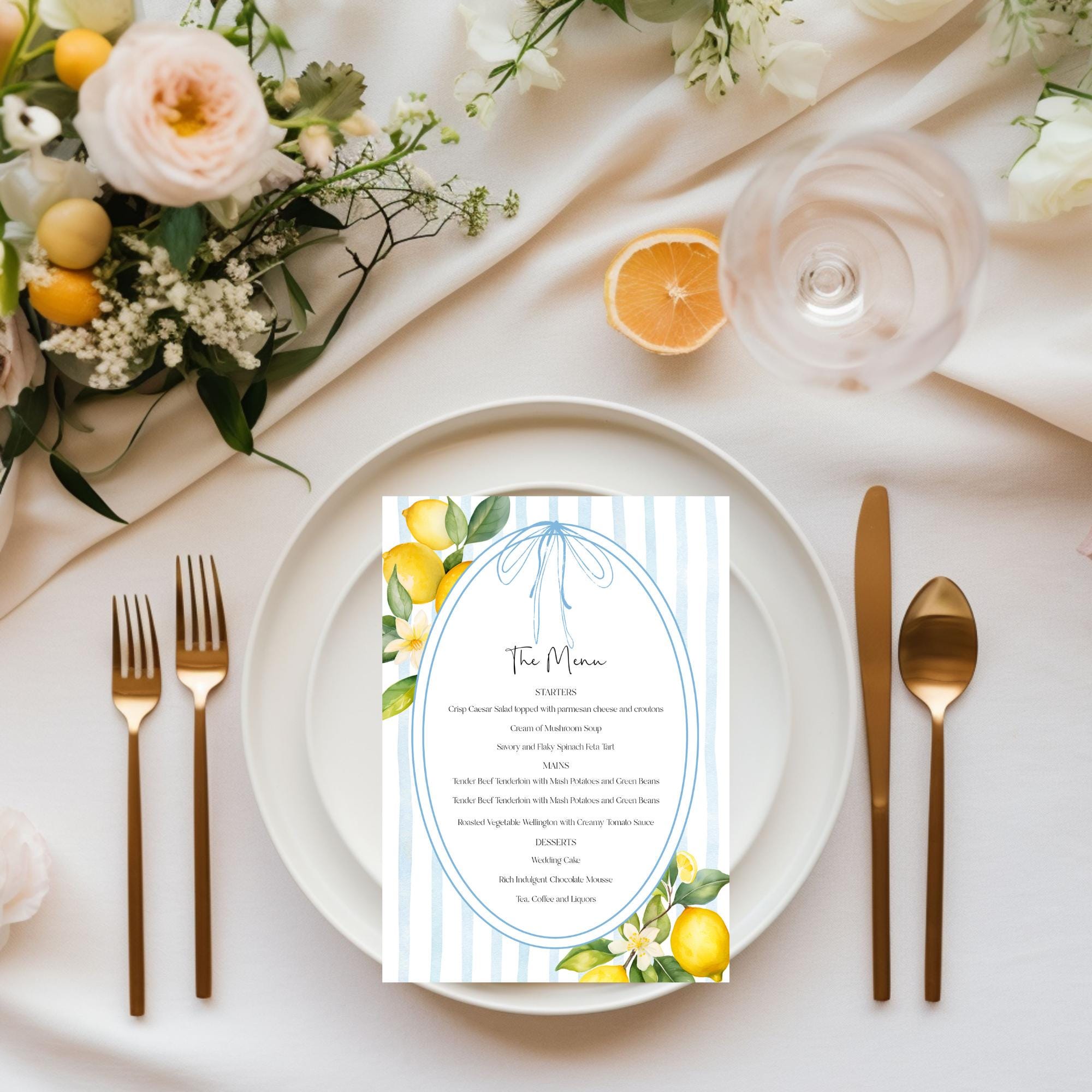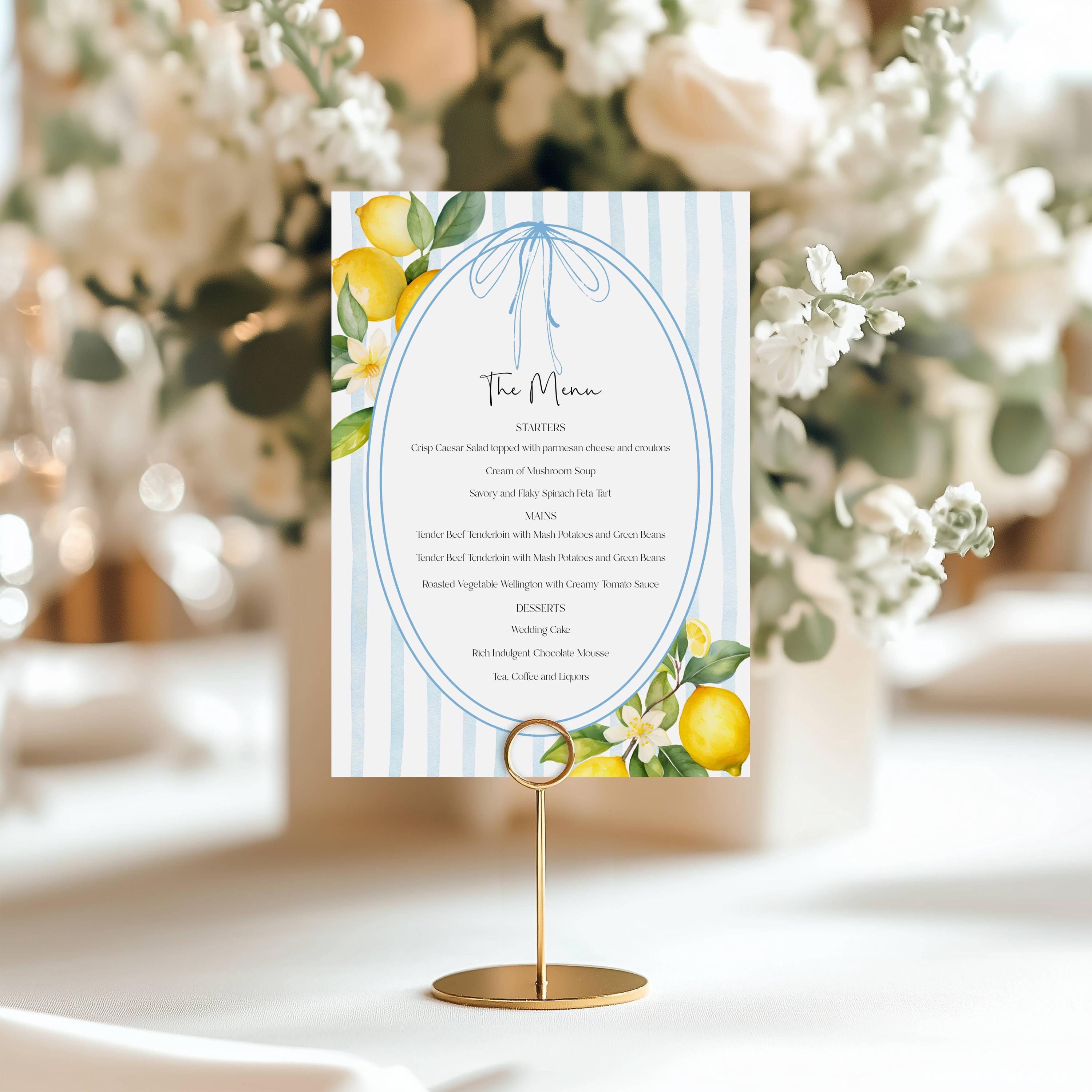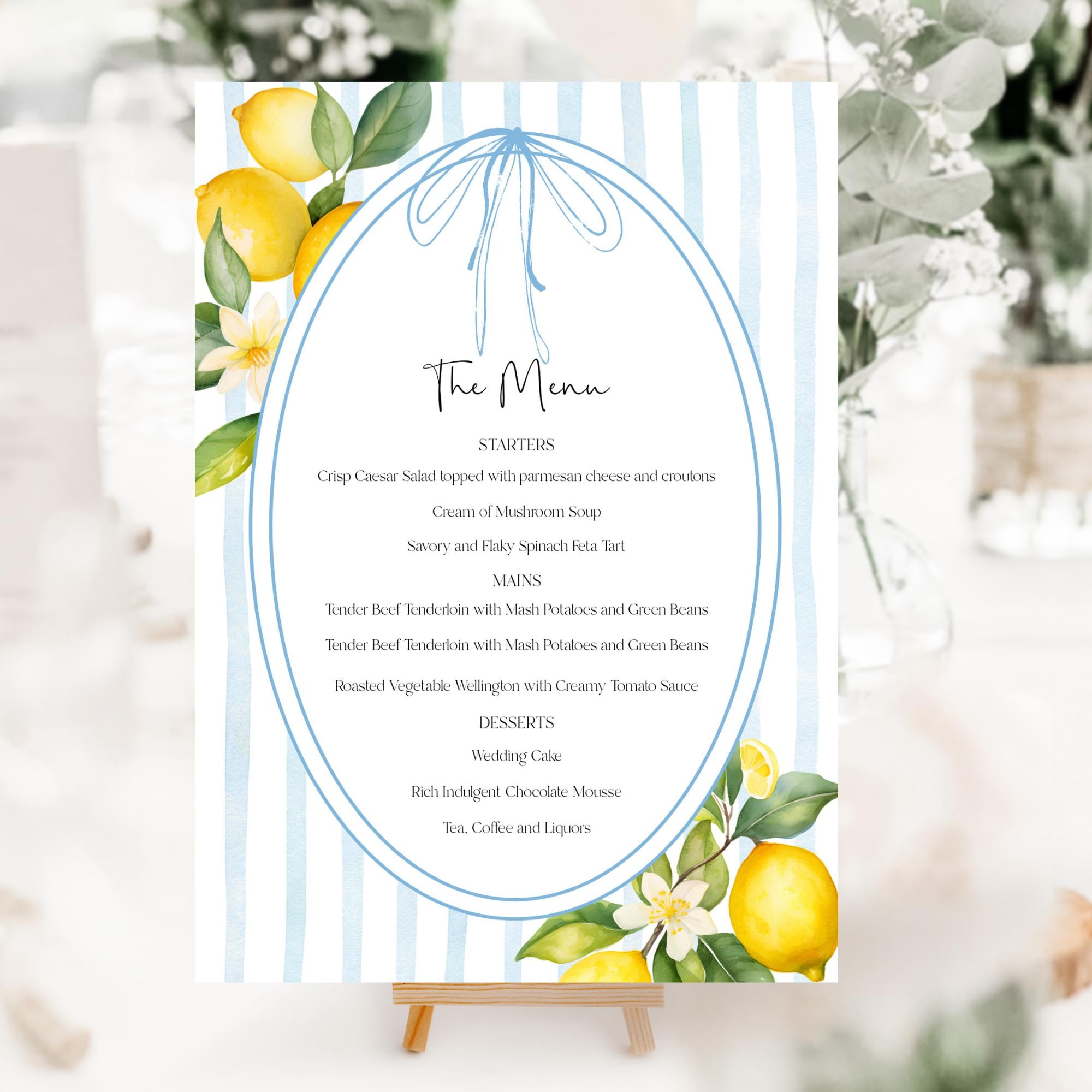 Lemons Table Menu Template. An Instant download digital file for you to edit in your web browser with Templett straight after your purchase. Once personalized you are ready to print.
