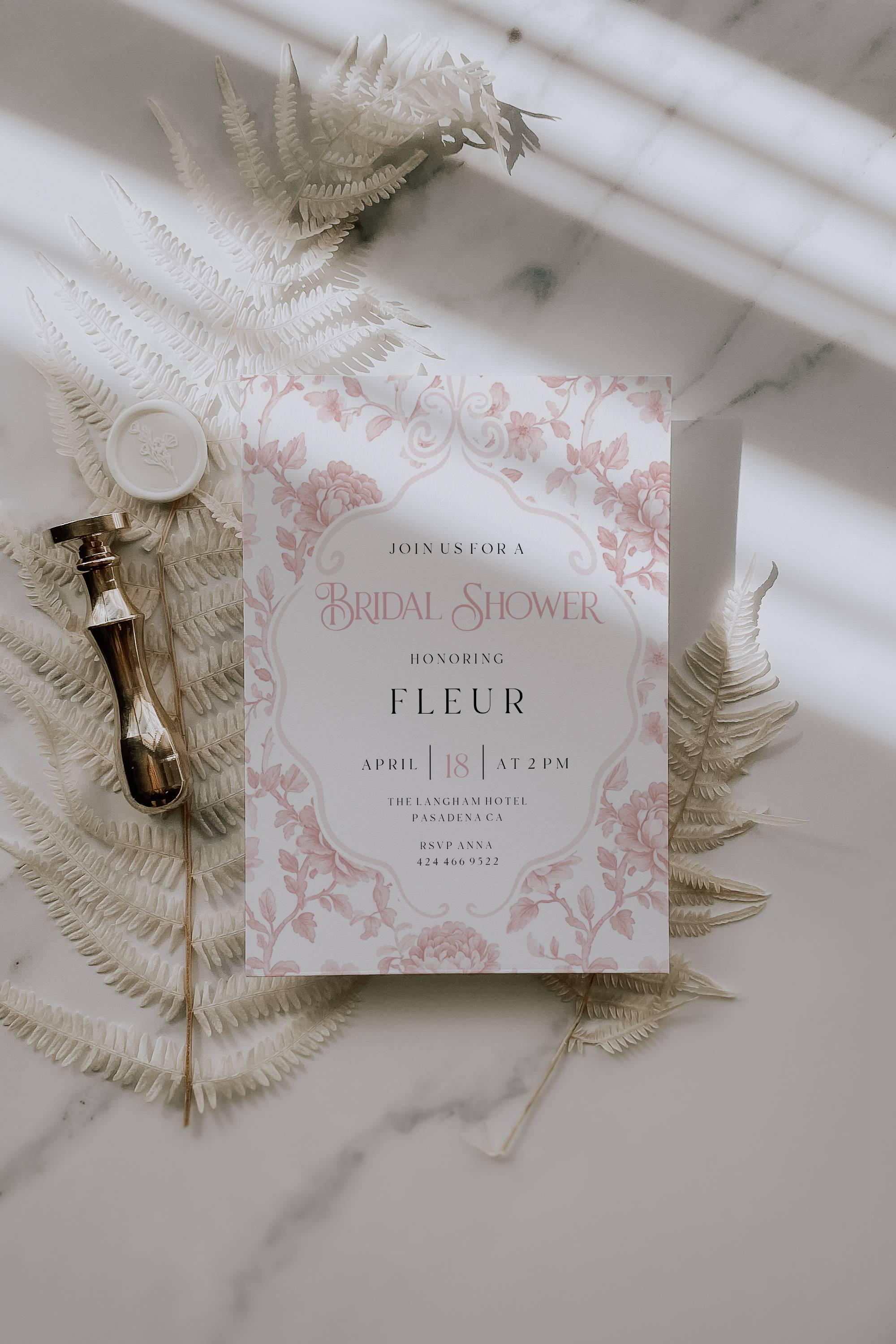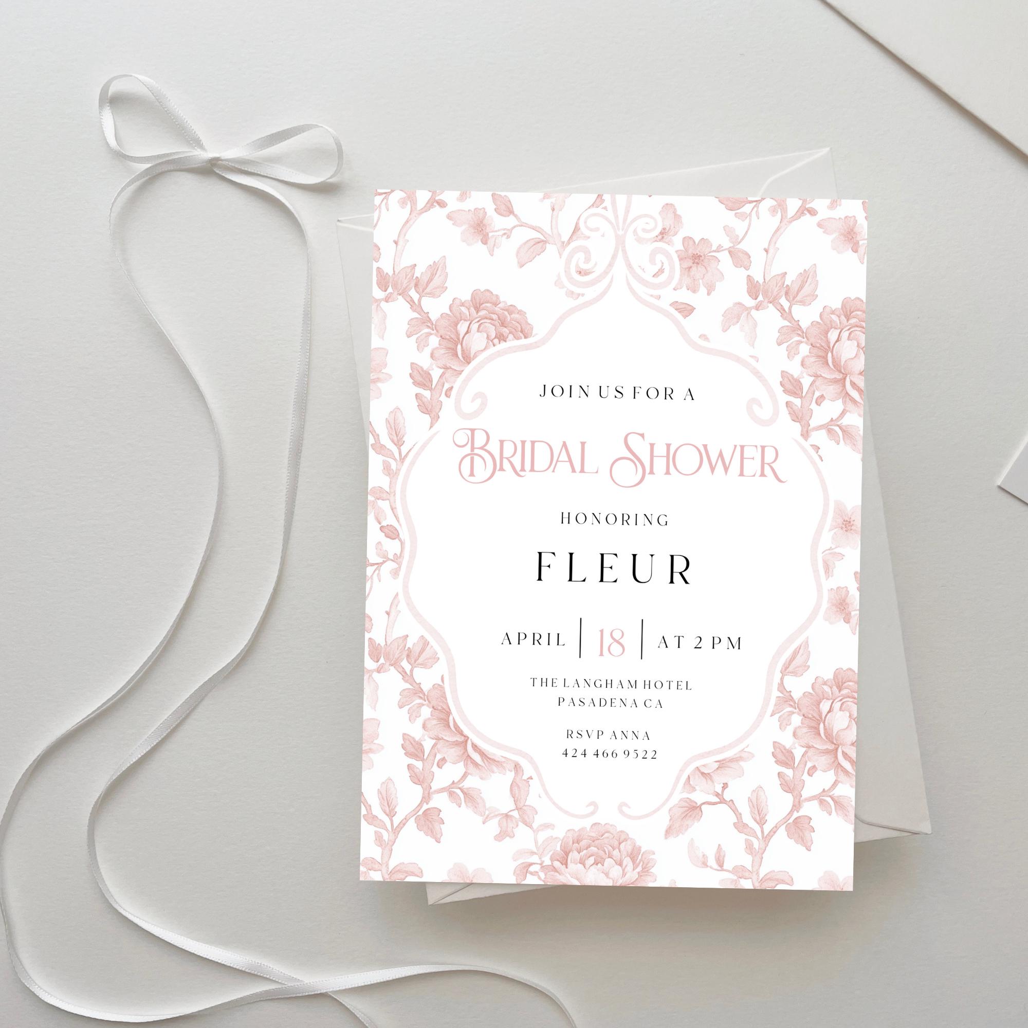 Blush Toile Bridal Shower Invitation Template. An Instant download digital file for you to edit in your web browser with Templett straight after your purchase. Once personalized you are ready to print.