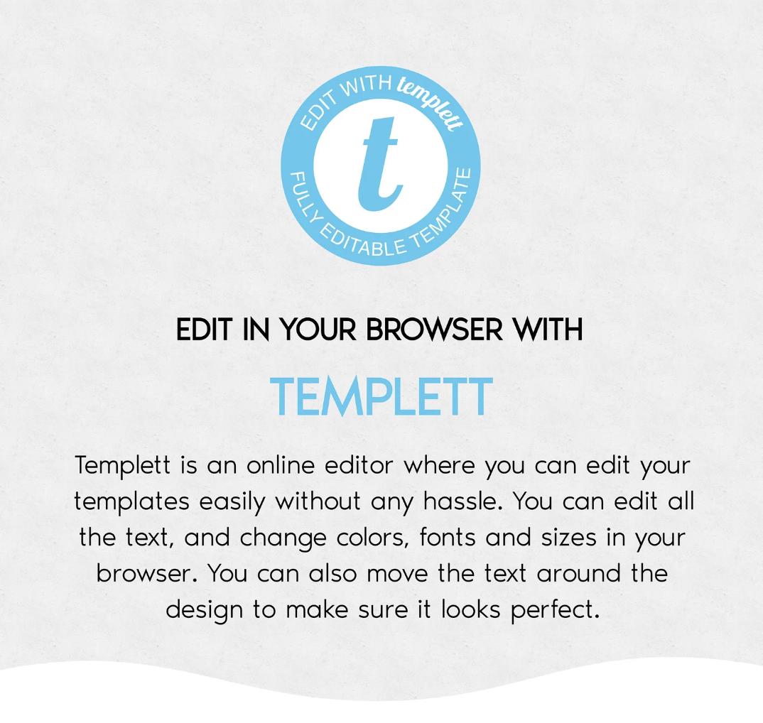 Once making your purchase, you will receive an email from Templett within a few minutes, click on the link that takes you directly to Templett where you can access your purchased files. PLEASE NOTE: you will have to create an account if you do not already have one, then you can edit your template, you can return and re-edit anytime until you are happy. Be sure to save as you go. Once you are satisfied download and print yourself or professionally.