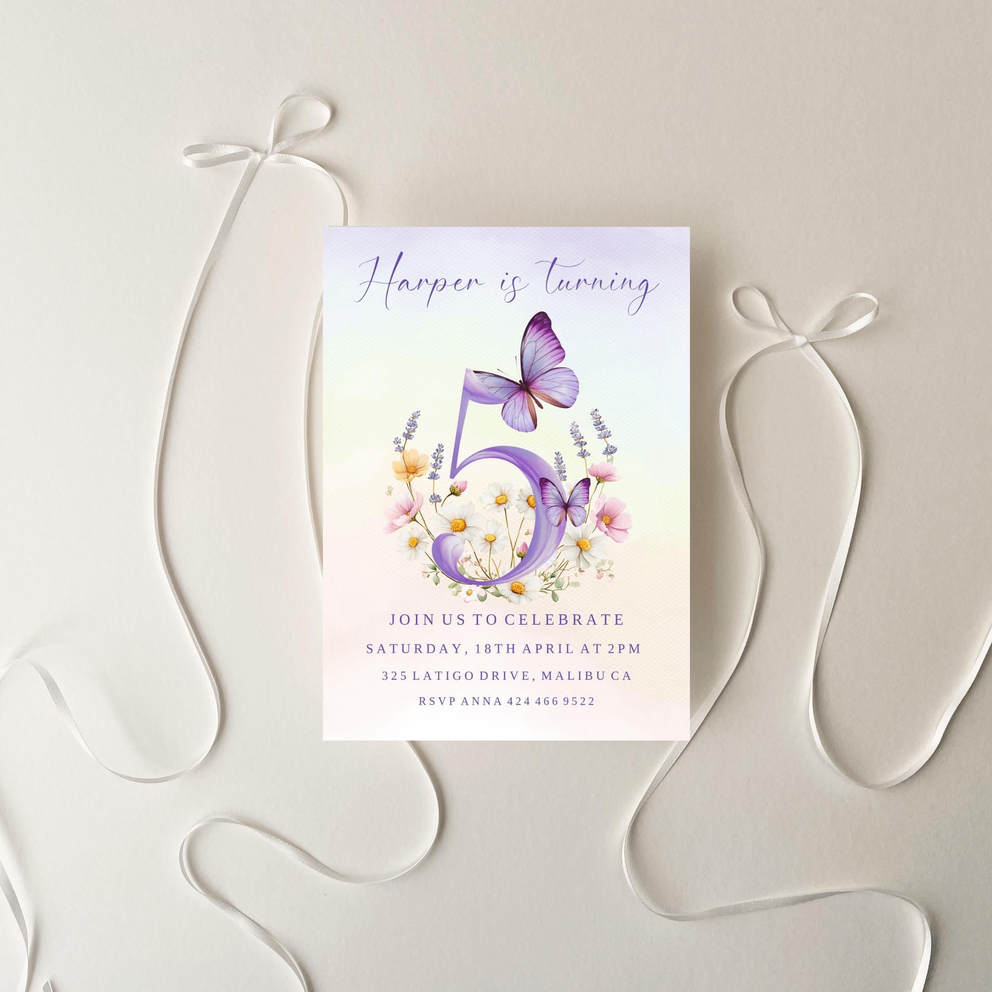 Butterfly 5th Birthday Invitation Template. An Instant download digital file for you to edit in your web browser with Templett straight after your purchase. Once personalized you are ready to print.