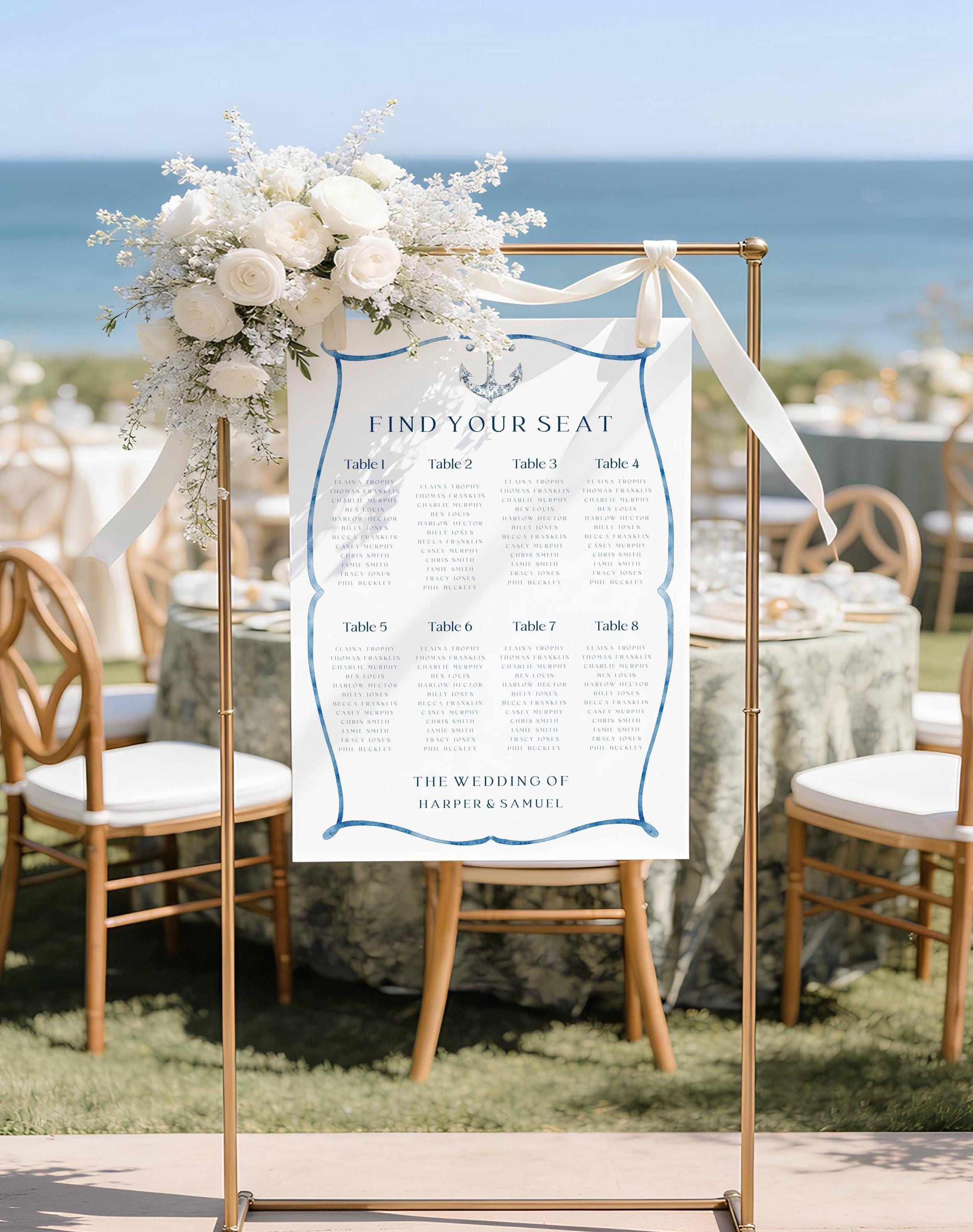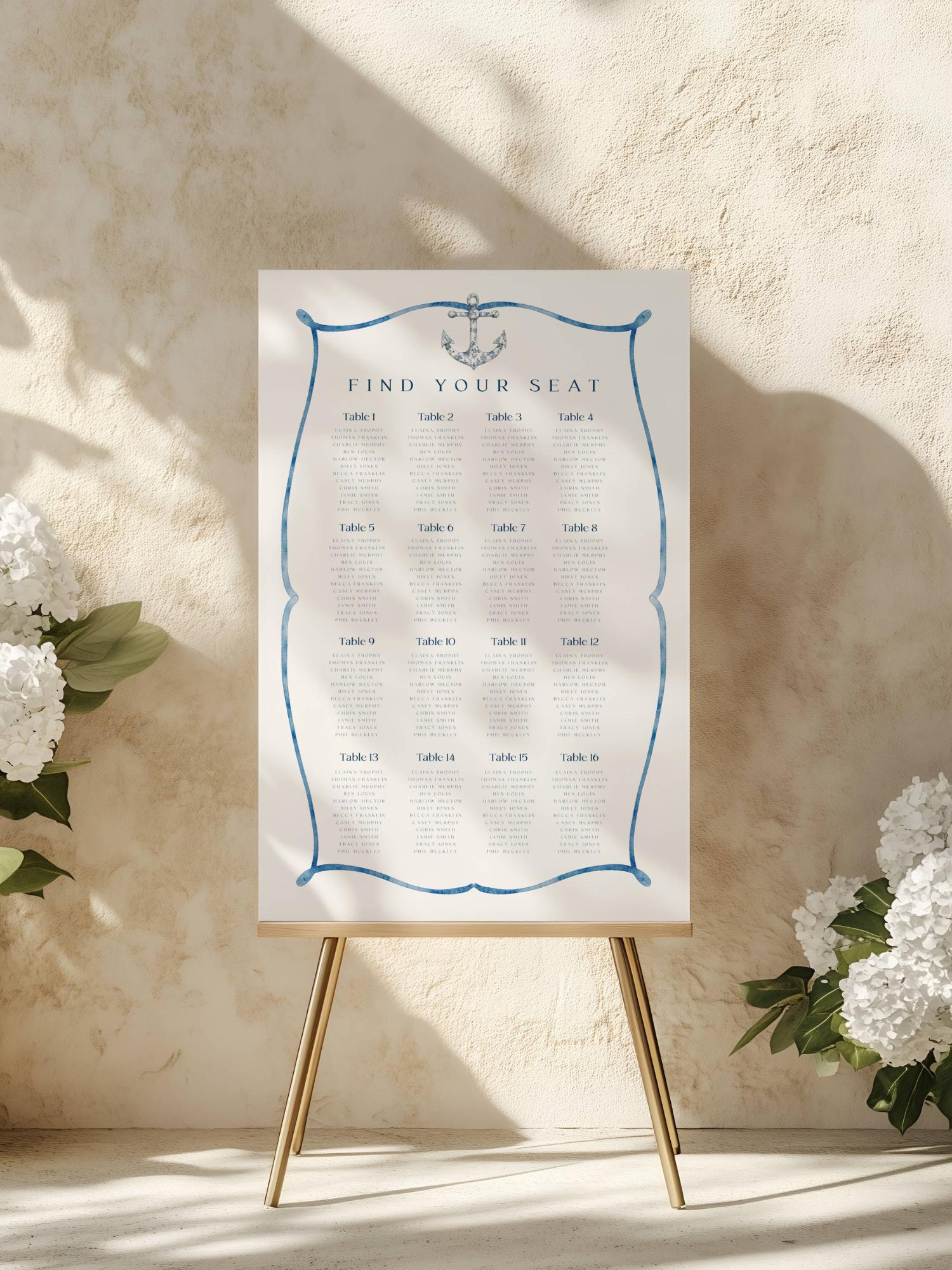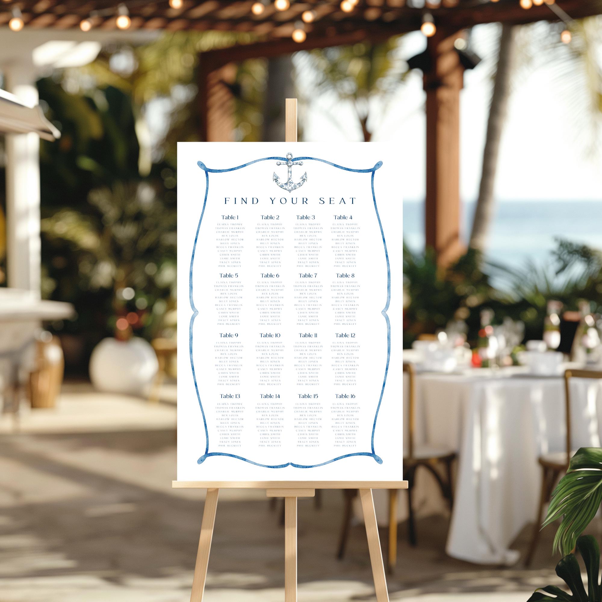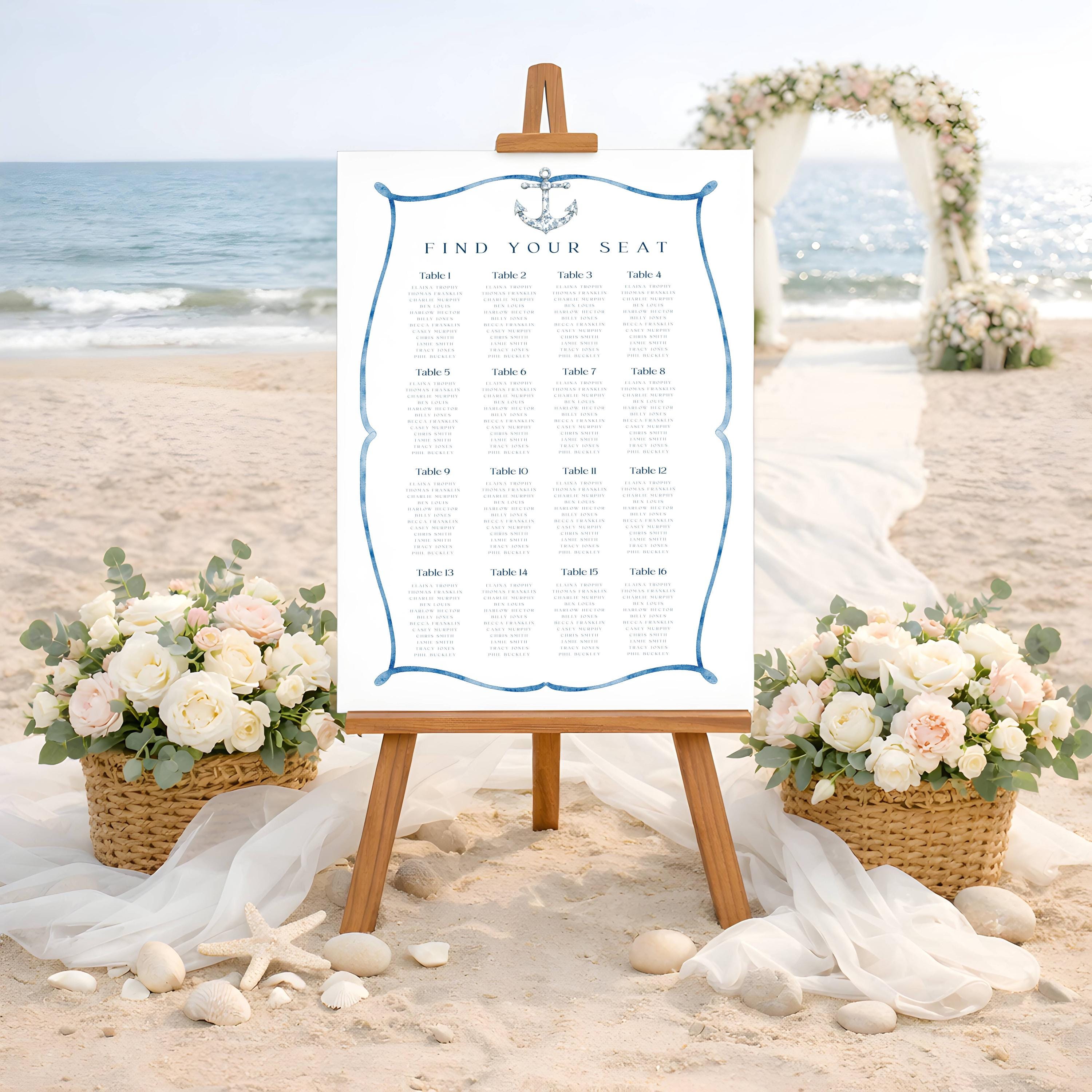Coastal Wedding Seating Plan Sign Template. An Instant download digital file for you to edit in your web browser with Templett straight after your purchase. Once personalized you are ready to print.