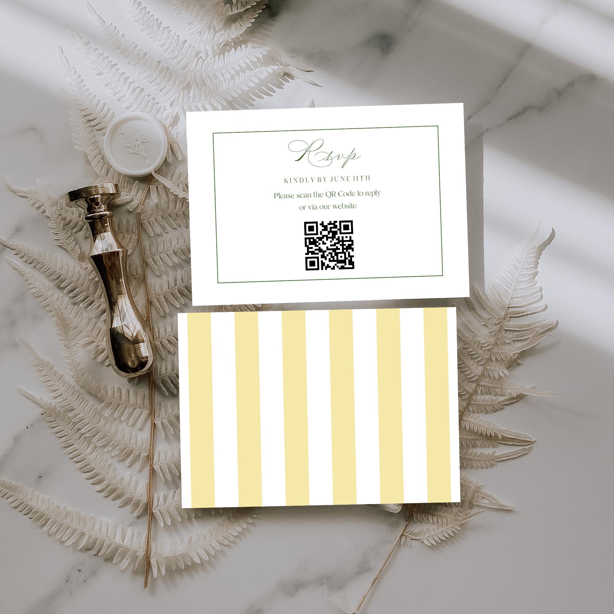 You will need to replace the QR Code by creating your own and uploading the new one that links to your wedding website. There are many websites that you can create a free custom QR code. If you don't want to use a QR Code you can easily delete this from the Template. If the Rsvp does not have a QR code, you can simply upload one.