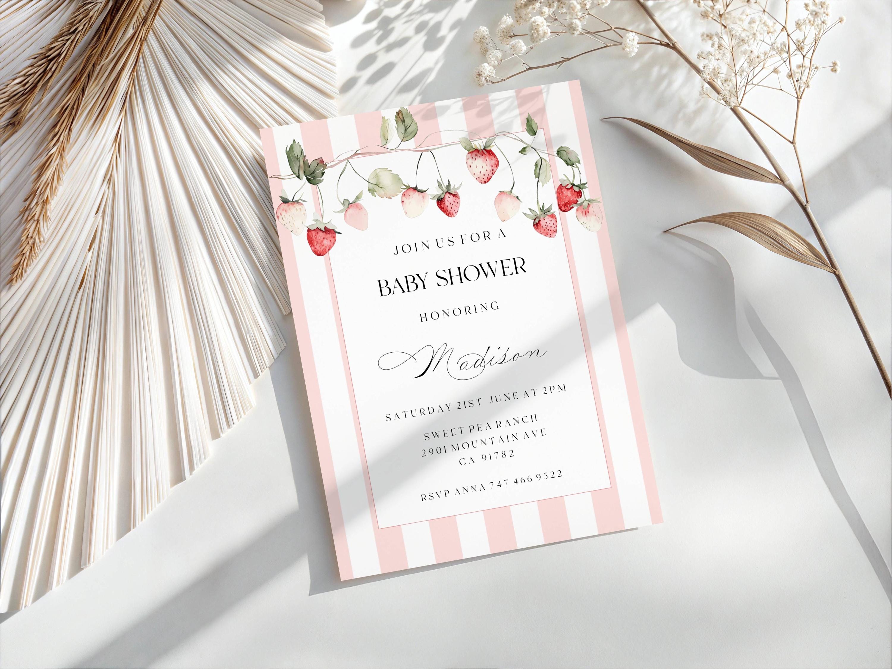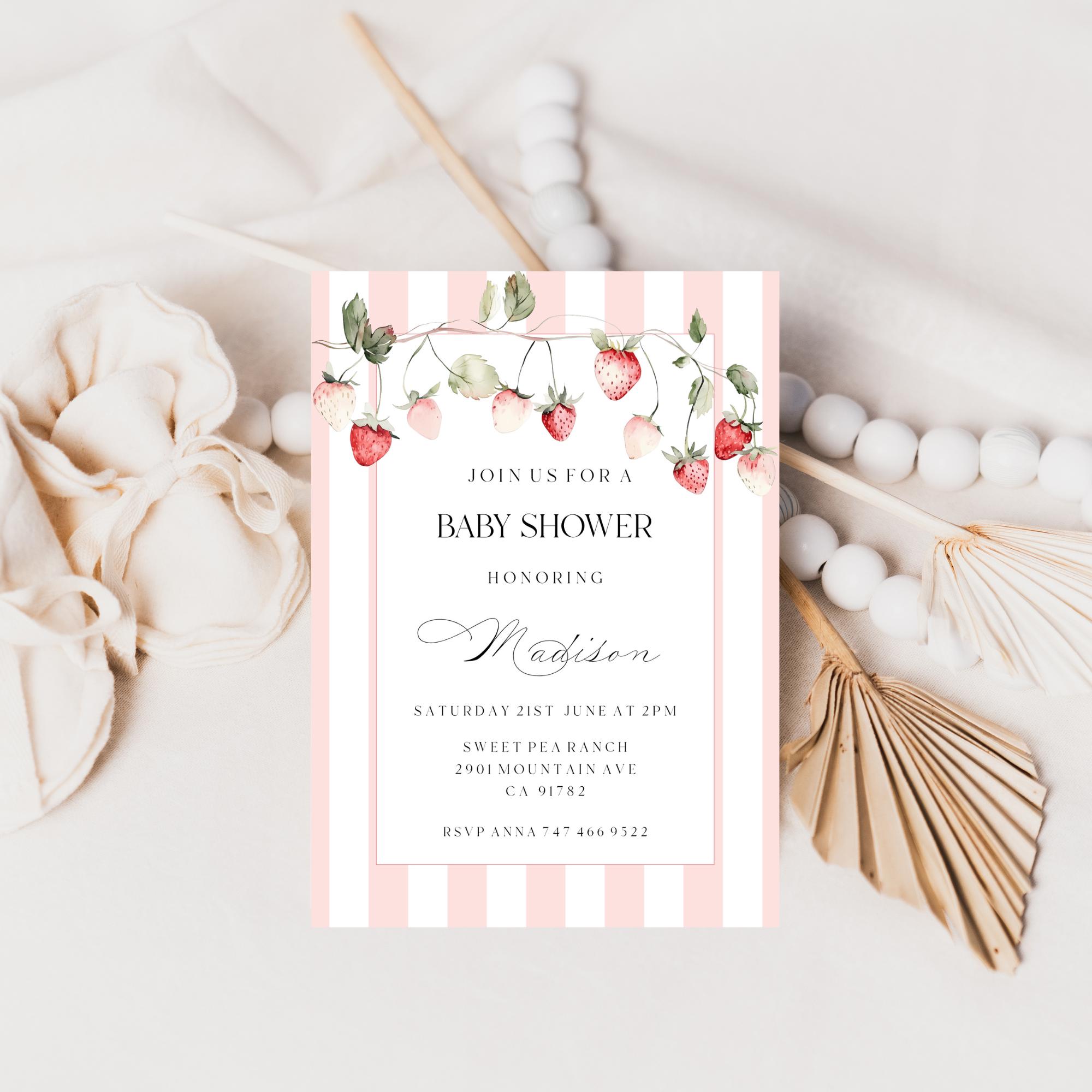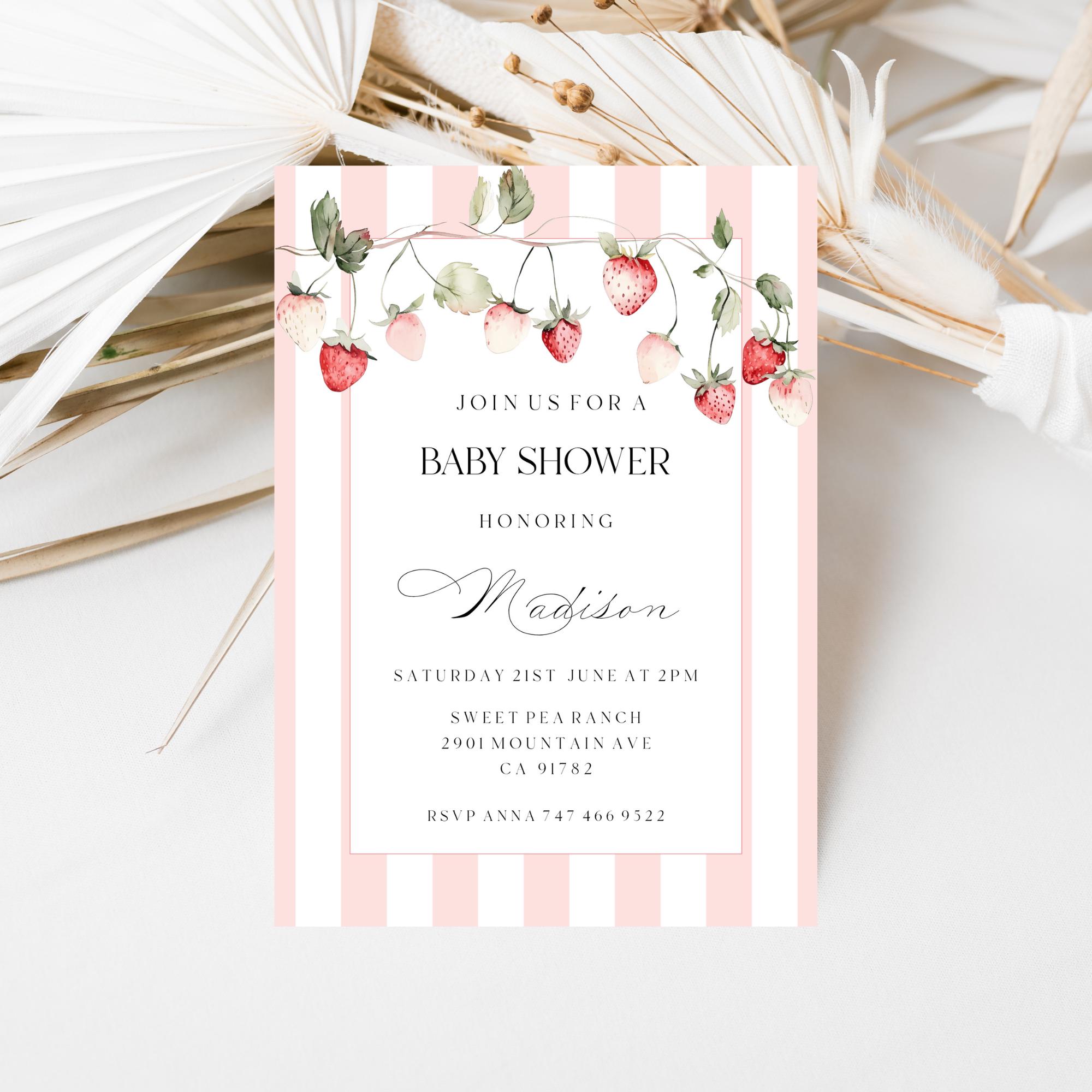 Wild Strawberries Baby Shower Invitation Template. An Instant download digital file for you to edit in your web browser with Templett straight after your purchase. Once personalized you are ready to print.