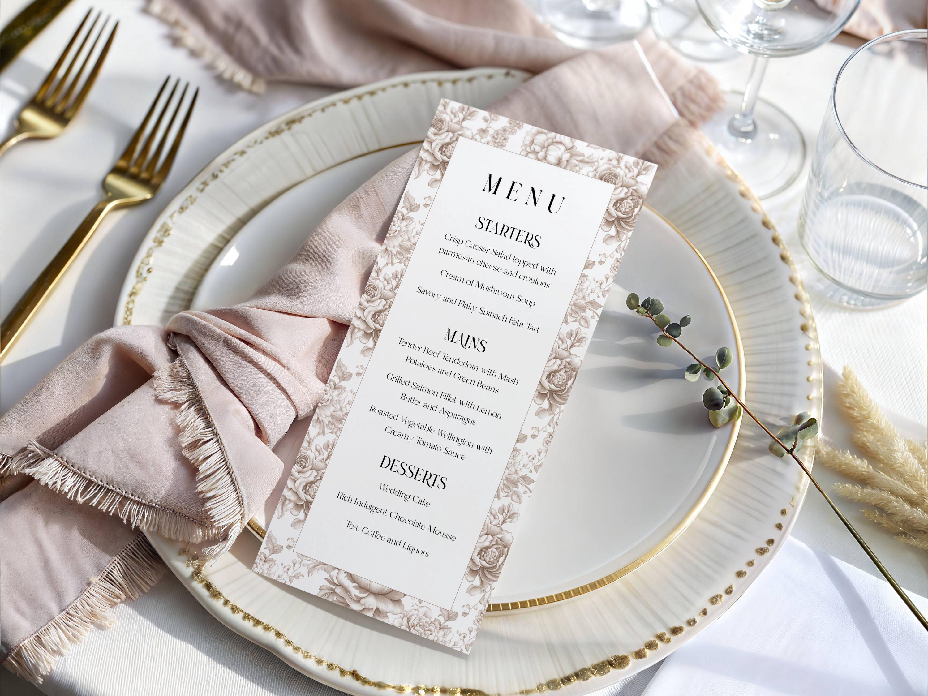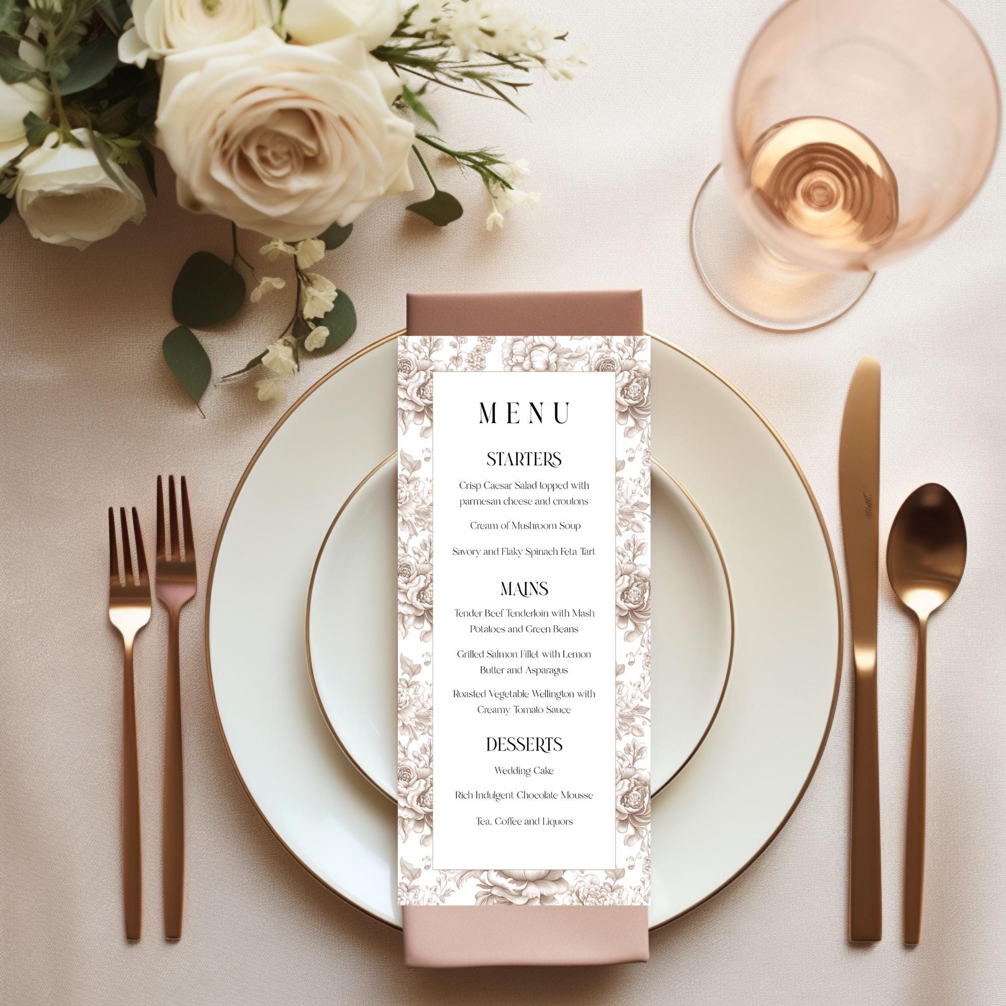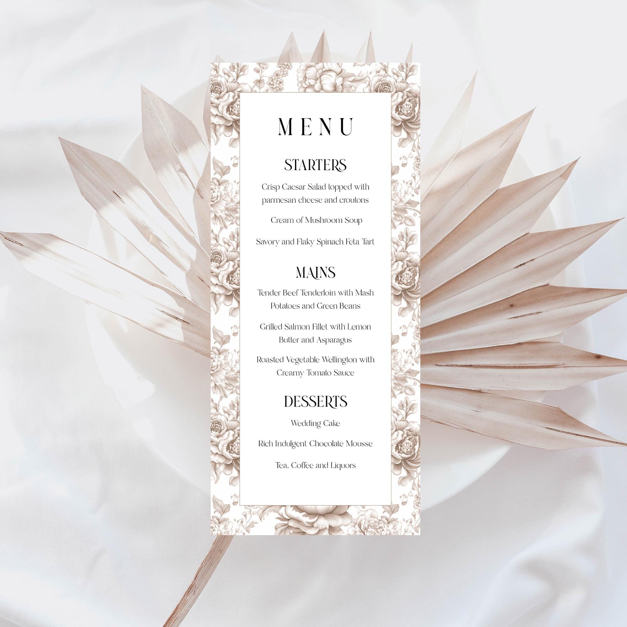Neutral Toile Wedding Menu Template. An Instant download digital file for you to edit in your web browser with Templett straight after your purchase. Once personalized you are ready to print.