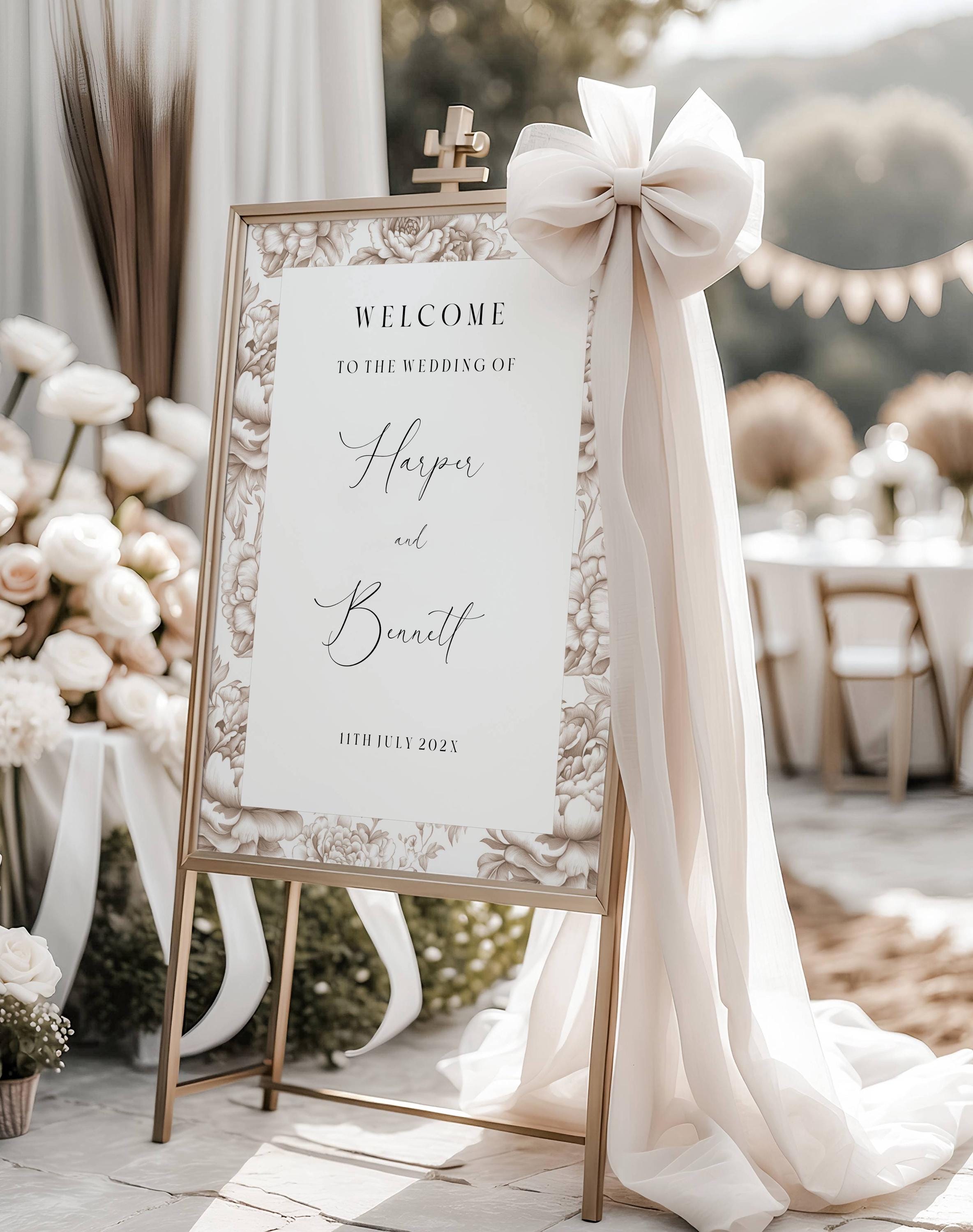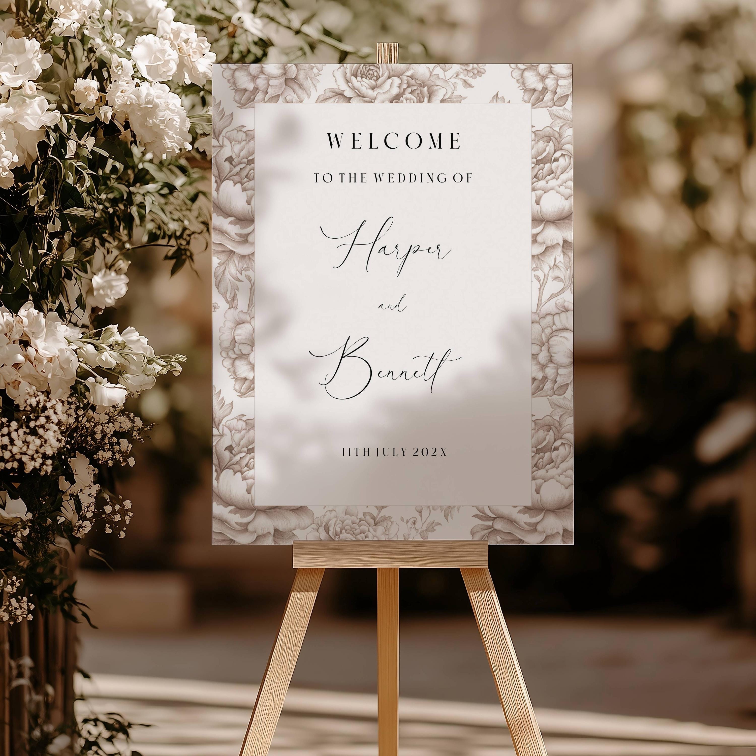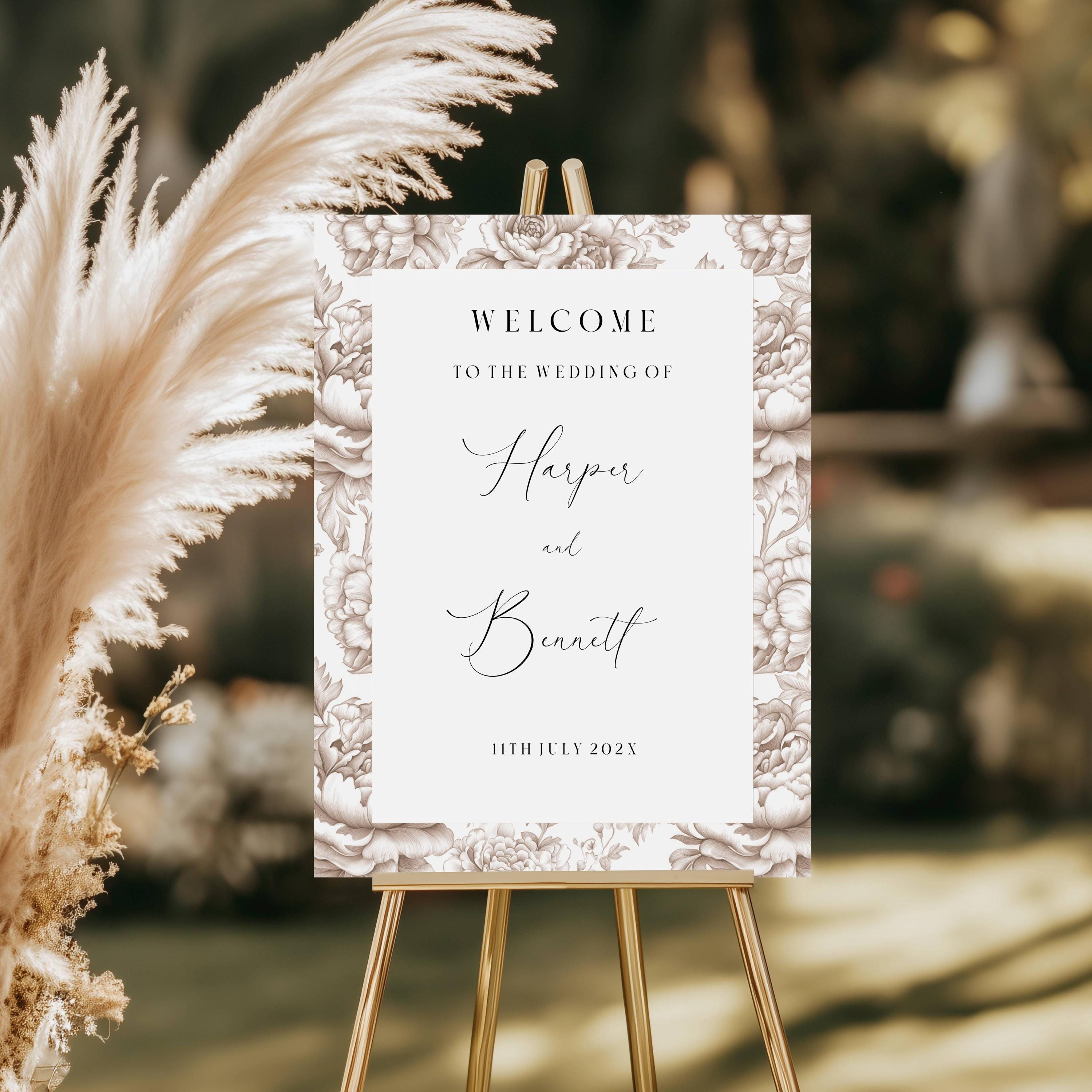 Neutral Toile Wedding Welcome Sign Template Template. An Instant download digital file for you to edit in your web browser with Templett straight after your purchase. Once personalized you are ready to print.